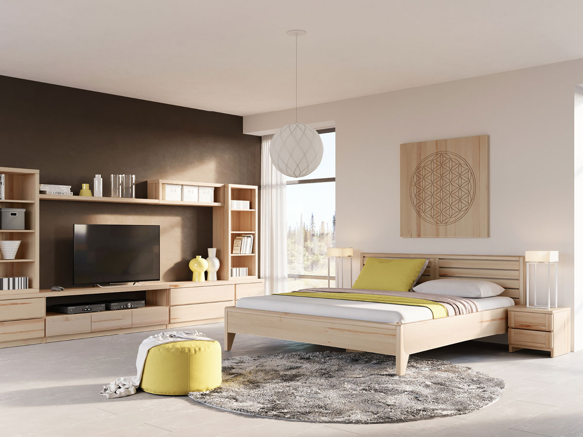 Luft, Wärme und Beständigkeit! Elemente, die uns dank „Nina“ mit einer guttuenden Atmosphäre umgeben. Das luftige Spiel zwischen Holz und Freiräumen im Betthaupt gibt dem Massivholzbett Eleganz.