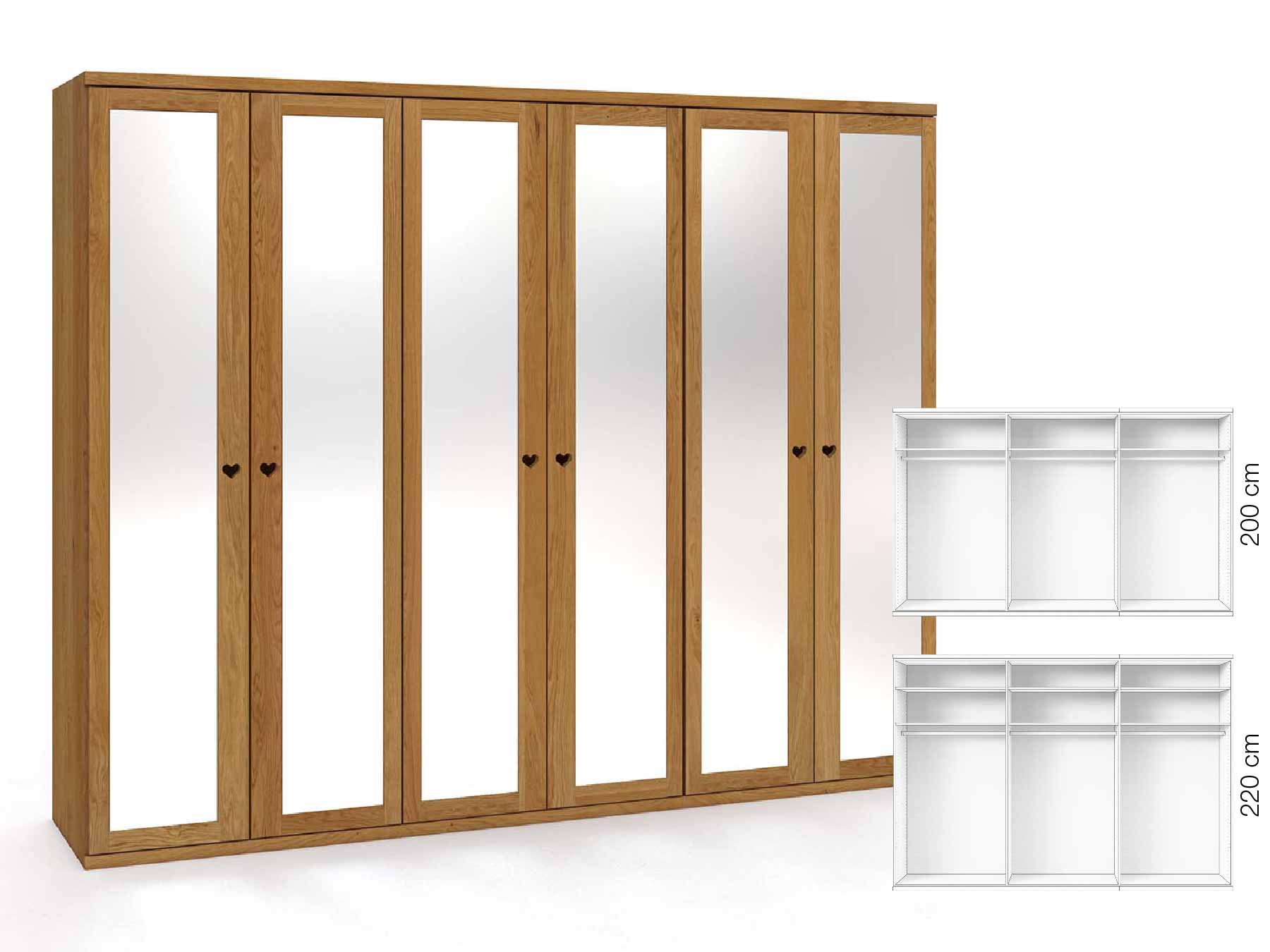 Viel Stauraum für Ihre gesamte Garderobe! Die individuell anpassbare Inneneinrichtung von „Sandra“ mit höhenverstellbaren Fachböden, Schubladen, Schubladeneinsätzen oder Kleiderstangen bietet Ihnen genau den Platz, den Sie benötigen. Der Schrank passt sich perfekt Ihren Wünschen an! Wählen Sie zwischen verschiedenen Griff-Fräsungen, um der Front eine zusätzliche Eleganz zu verleihen. Die Spiegeltüren fügen dem Design eine moderne Raffinesse hinzu und lassen den Raum größer wirken. Das nachhaltige Massivholz sorgt zudem für ein angenehmes Raumklima, indem es Feuchtigkeit aus der Luft aufnimmt und wieder abgibt.