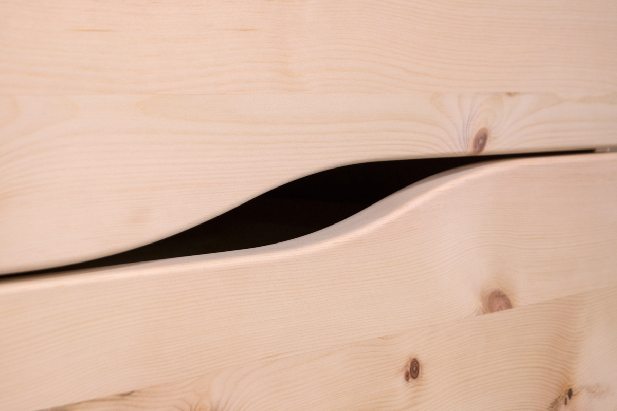 Der Zirbenkasten wird mit massiven Holzstärken hergestellt. Fronten 25 mm, Korpus 18 mm und Deckplatte 40 mm Zirbenvollholz. Rückwände und Bodenplatten der Laden aus stabilem Buchen-Schichtholz.