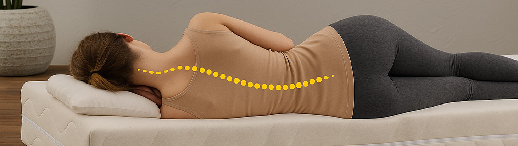 Eine orthopädisch korrekte Lagerung der Wirbelsäule bedeutet, dass die Wirbelsäule in ihrer natürlichen Doppel-S-Form (Lordosen und Kyphosen) erhalten bleibt – also weder abgeflacht noch übermäßig gekrümmt wird. Ziel ist es, Rücken und Wirbel so zu positionieren, dass Muskeln, Bandscheiben und Gelenke entlastet werden und sich im Schlaf optimal regenerieren können.