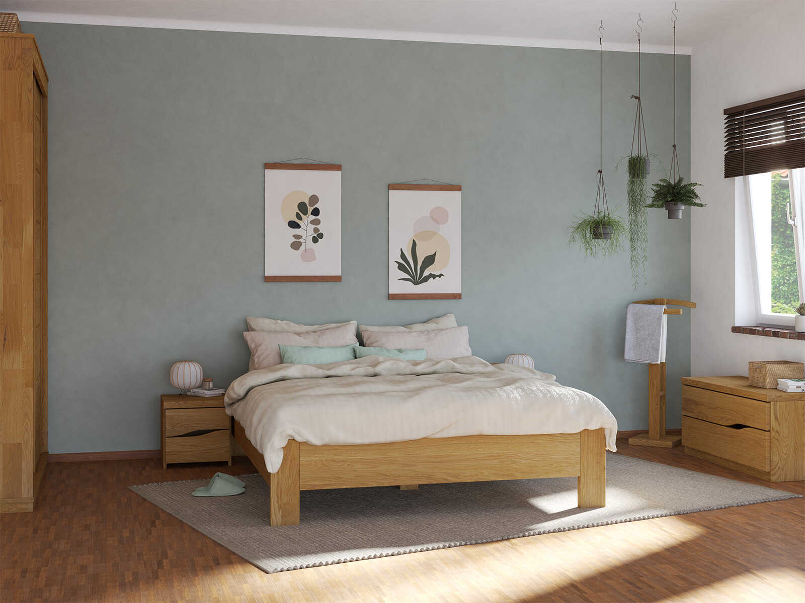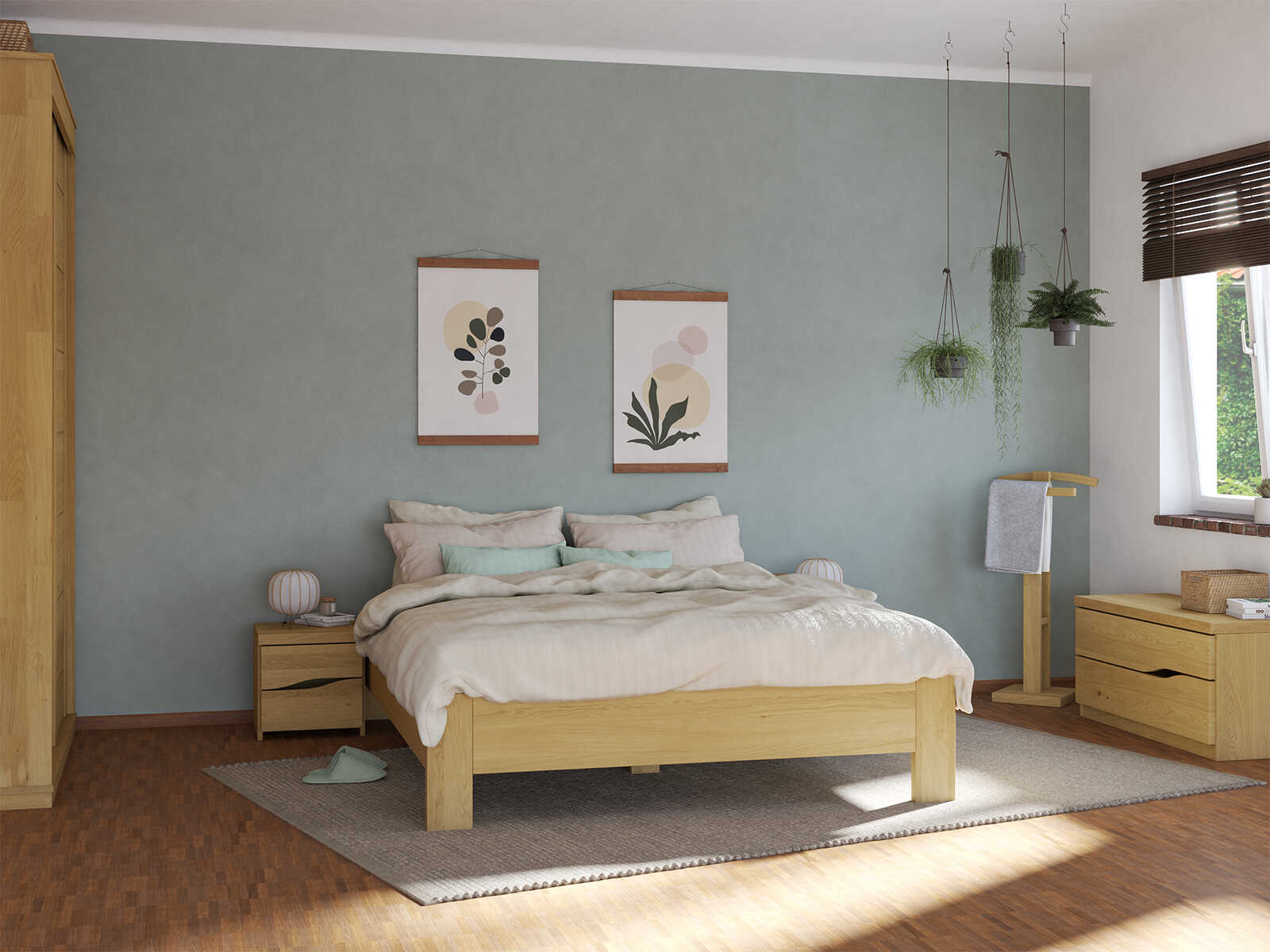 Immer nur gerade?! Das ist nicht „Astrids“ Motto. Die geschwungene Linie des Nachttisches weckt das Auge und unterstreicht den dynamischen, wachen Charakter des Massivholzes.