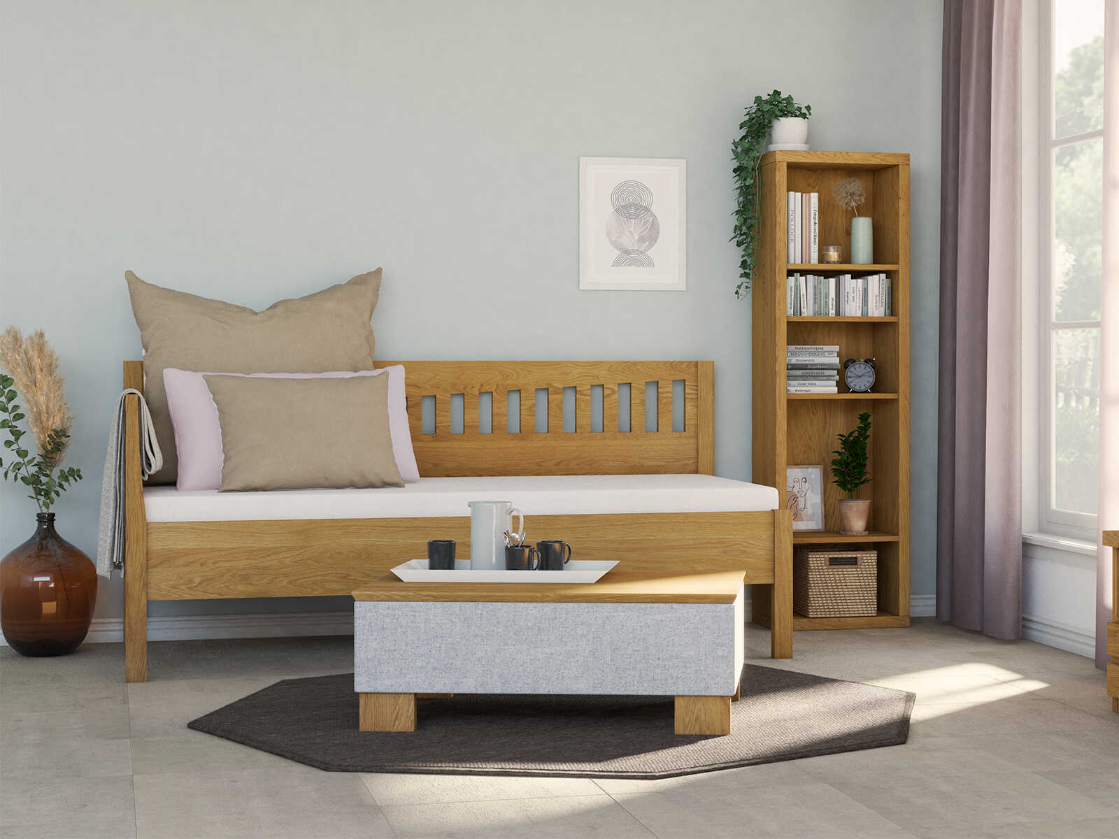 Die Liegehöhe des Massivholz-Schlafsofas beträgt 57 cm.