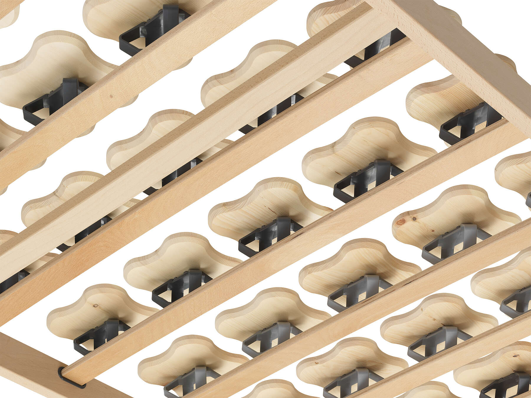Der Tellerlattenrost mit einer Höhe von 11 cm passt sich 3-dimensional an Ihren Körper an. Die beweglichen Teller geben in alle Richtungen flexibel nach: nach unten, nach vorne und hinten sowie seitlich. Dieser Lattenrost stützt nicht nur in der Länge der Matratze, sondern auch in der Breite. Die Teller bewegen sich mit dem Körper mit und reagieren einzeln und dadurch punktelastisch auf Belastungen. Sie federn nicht nur, sondern lassen sich in jede Richtung kippen. Sie bekommen auf diese Weise auch am Rand der Matratze die bestmögliche Anpassung an Ihren Körper. Wir empfehlen die Tellerlattenroste für eine hochsensible Anpassung an den Körper.