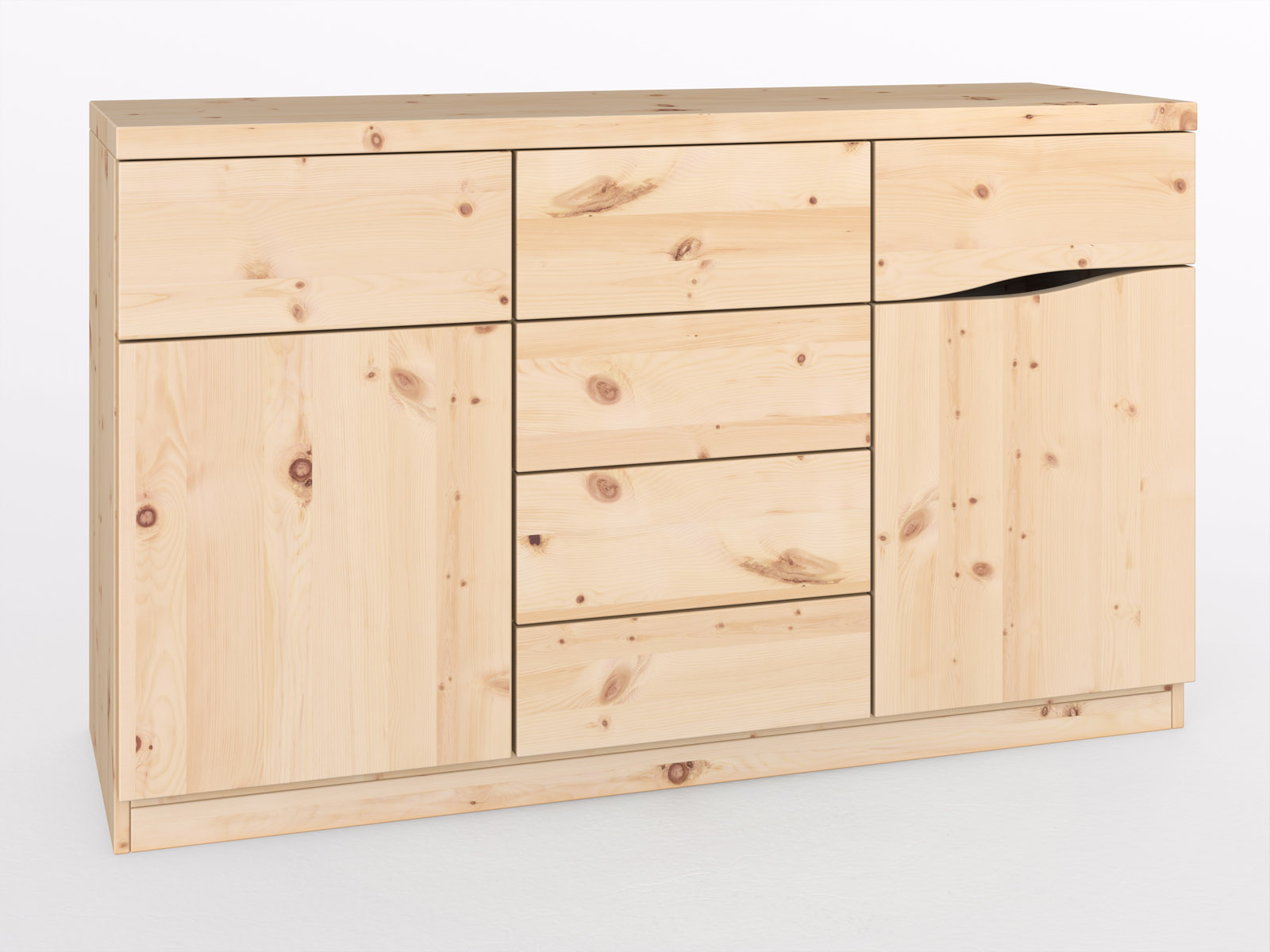 Die Zirbenkommode „Astrid" zeigt sich schwungvoll und in bester Qualität. Durch die charakteristische Maserung des Zirbenholzes und die hochwertige Verarbeitung ist sie in jedem Wohnraum hübsch anzusehen. Wählen Sie aus 9 Ausführungen: mit Laden oder Tür und/oder mit Freifächern. Mit praktischen TIP-On Auszügen bringt diese Kommode den wohltuenden Duft nach Zirbe in die Räume.